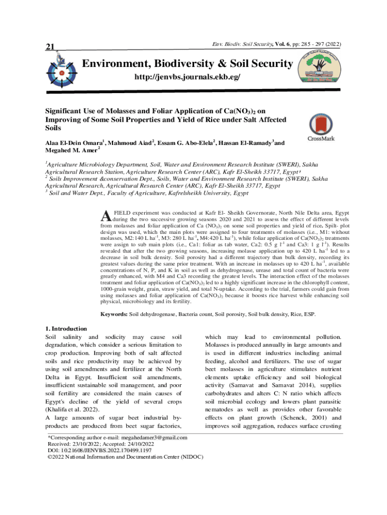 Env. Biodiv. Soil Security, Vol. 6, pp: 285 297 (2022)21Environment, Biodiversity & Soil Security http://jenvbs.journals.ekb.eg/Significant Use of Molasses and Foliar Application of Ca(NO3)2 on Improving