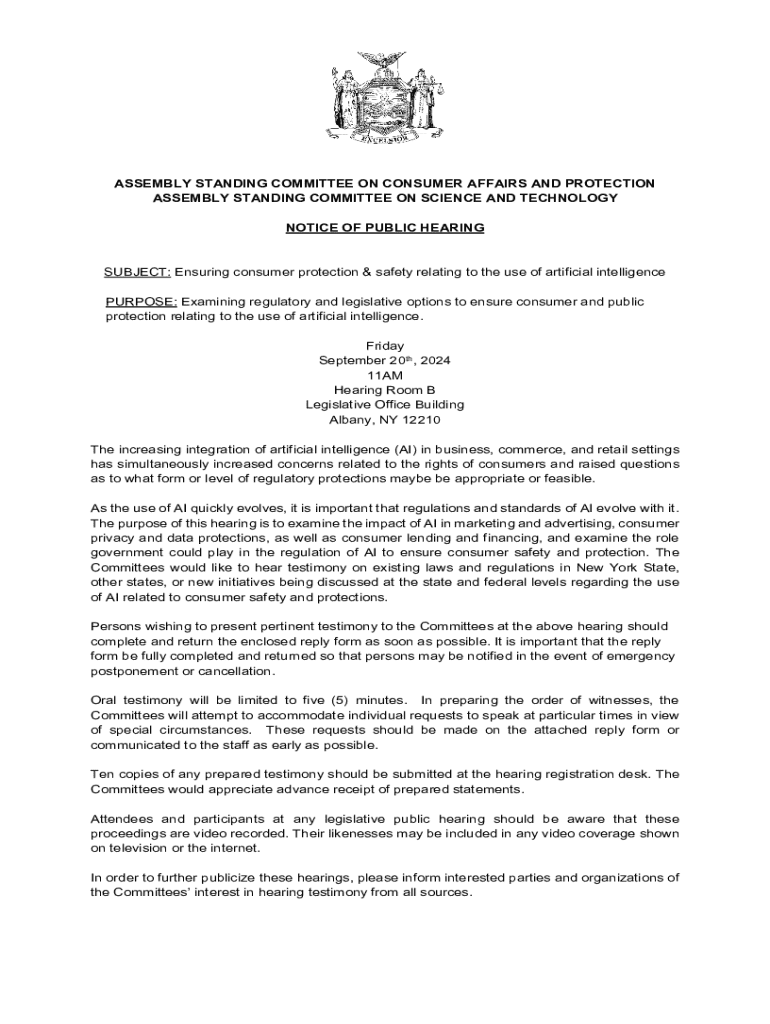 ASSEMBLY STANDING COMMITTEE ON CONSUMER AFFAIRS AND PROTECTION ASSEMBLY STANDING COMMITTEE ON SCIENCE AND TECHNOLOGY NOTICE OF PUBLIC HEARINGSUBJECT: Ensuring consumer protection & safety relating