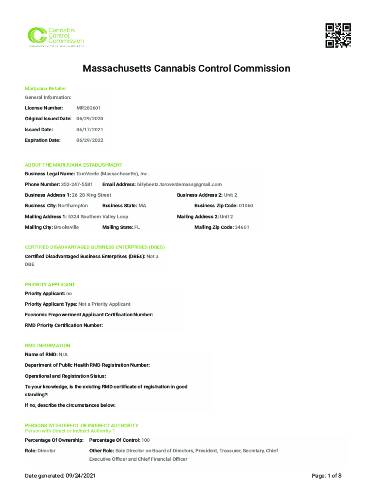 Massachusetts Cannabis Control Commission Marijuana Retailer General Information: License Number:MR282601Original Issued Date: 06/29/2020 Issued Date:06/17/2021Expiration Date:06/29/2022ABOUT THE MARIJUANA ESTABLISHMENT Business Legal Name: ToroVerde (Massachusetts), Inc. Phone Number: 3522475581Email Address: billybeetz.toroverdemass@gmail.comBusiness Address 1: 2628 King Street Business City: NorthamptonBusiness Address 2: Unit 2Business State: MAMailing Address 1: 5324
