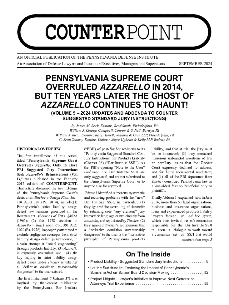 AN OFFICIAL PUBLICATION OF THE PENNSYLVANIA DEFENSE INSTITUTE An Association of Defense Lawyers and Insurance Executives, Managers and SupervisorsSEPTEMBER 2024PENNSYLVANIA SUPREME COURT OVERRULED
