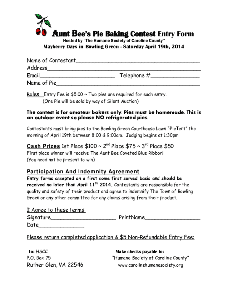 Get the free Aunt Bee’s Pie Baking Contest Entry Form