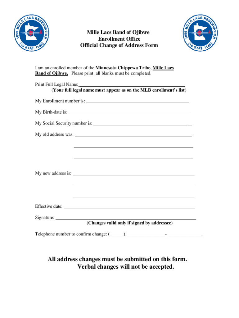 Complete the Official Change of Address Form for the Mille Lacs Band of Ojibwe to update your enrollment details. Ensure accurate submission for validation.