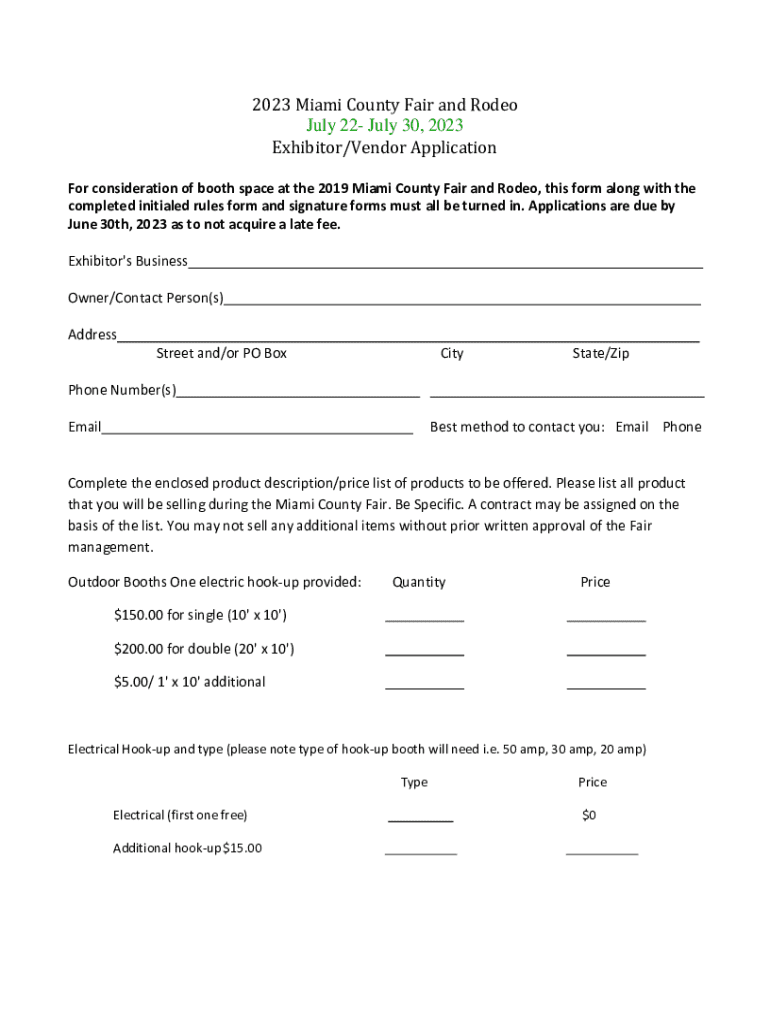 Apply for booth space at the 2023 Miami County Fair and Rodeo. Complete the application and submit by June 30, 2023 to avoid late fees.