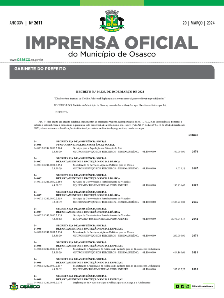 ANO XXV | N 261120 | MARY | 2024www.Osasco.SP.gov.brGABINETE DO PREFEITODECRETO N. 14.129, DE 20 DE MAR ODE 2024
