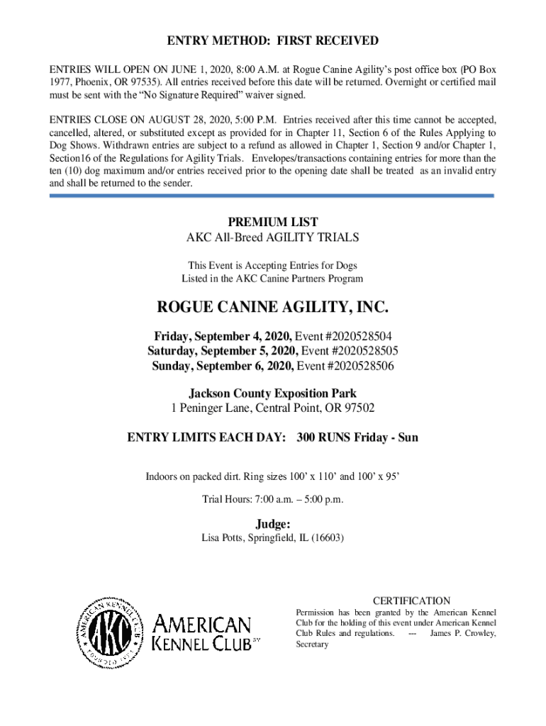 Join the AKC All-Breed Agility Trials hosted by Rogue Canine Agility from September 4-6, 2020. Ensure your dog\'s entry is submitted by August 28, 2020.