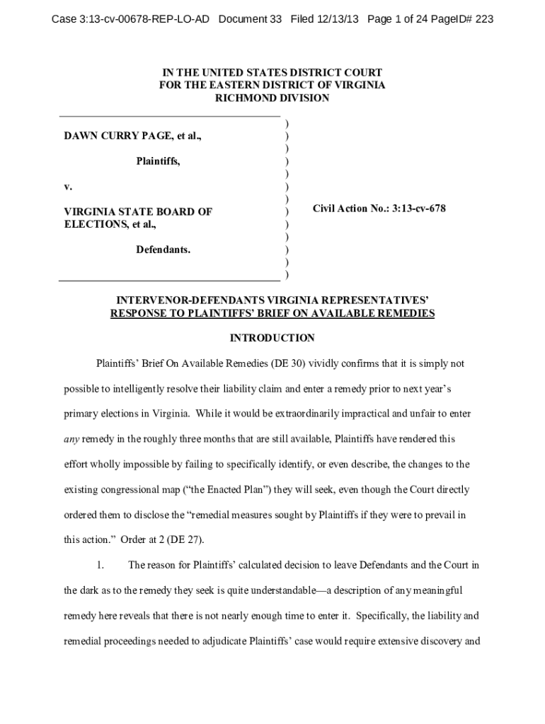 Case 3:13cv00678REPLOAD Document 33 Filed 12/13/13 Page 1 of 24 PageID# 223IN THE UNITED STATES DISTRICT COURT FOR THE EASTERN DISTRICT OF VIRGINIA RICHMOND DIVISION DAWN CURRY PAGE, et al., Plaintiffs,