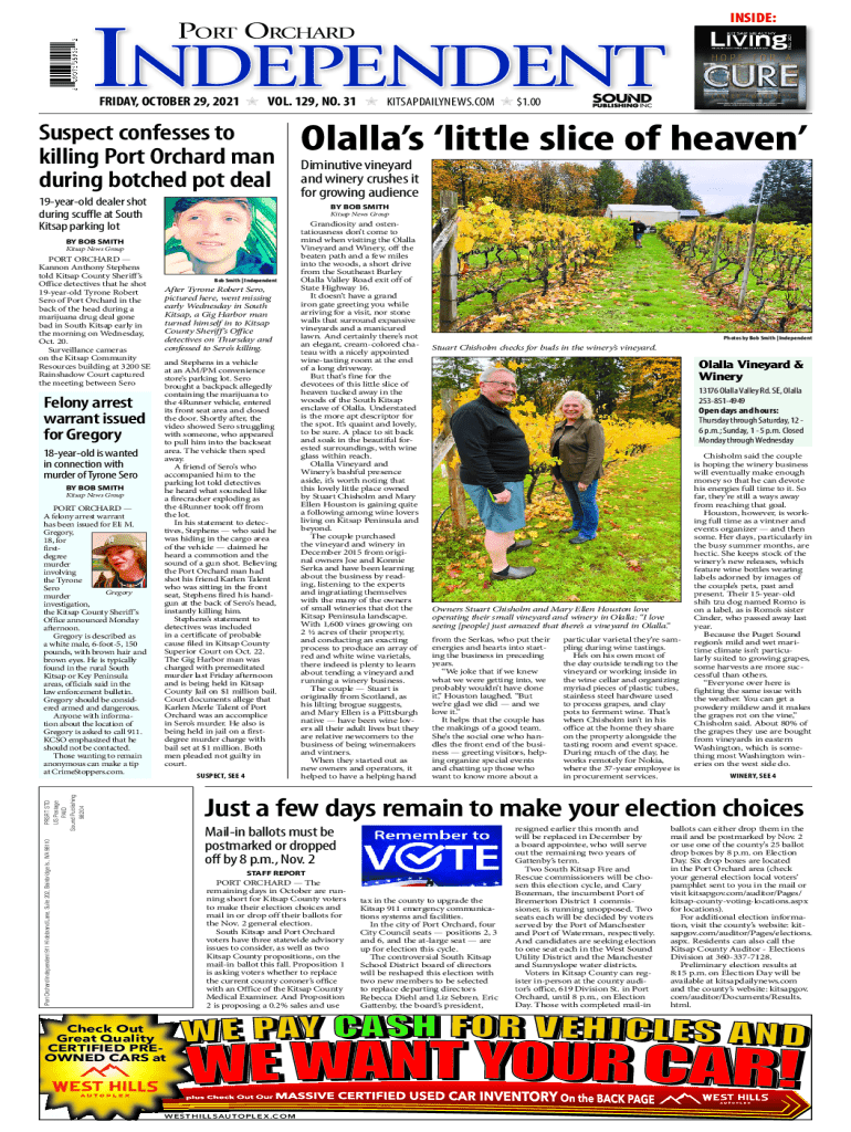 INSIDE:PORT ORCHARDINDEPENDENTOCTOBER 202119yearold dealer shot during scuffle at South Kitsap parking lotFALL 2021HEALTH AND WELLNESS IN KITSAPHOPE FOR ACANCER AWARENESS A SUPPLEMENT OF THE BAINBRIDGE ISL AND REVIEW, NORTH KITSAP HERALD,CENTRAL KITSAP REPORTER, & PORT ORCHARD INDEPENDENTOlallas little slice of heaven Diminutive vineyard and winery crushes it for growing audience BY BOB SMITH Kitsap News GroupBY BOB SMITH Kitsap News GroupPORT ORCHARD Kannon