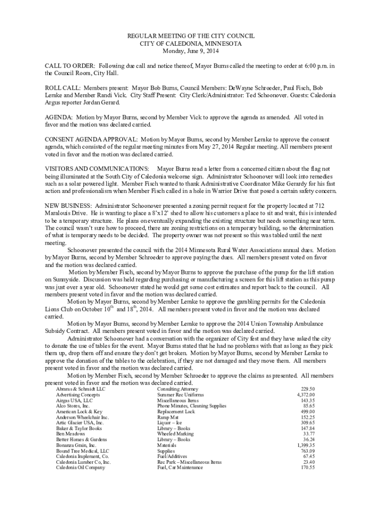 REGULAR MEETING OF THE CITY COUNCIL CITY OF CALEDONIA, MINNESOTA Monday, June 9, 2014 CALL TO ORDER: Following due call and notice thereof, Mayor Burns called the meeting to order at 6:00 p.m. in
