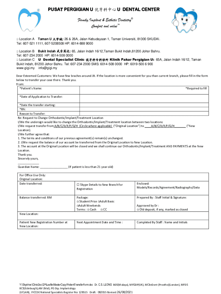 Submit a request to transfer your orthodontic, implant, or treatment location at Pusat Pergigian U across various branches in Johor Bahru.