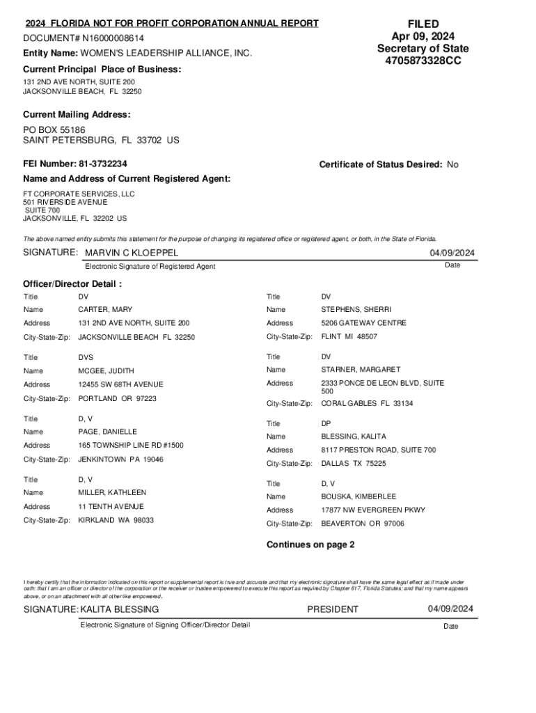 View the 2024 Annual Report for Women\'s Leadership Alliance, Inc., detailing registered agent info, officer/director details, and status updates in Florida.