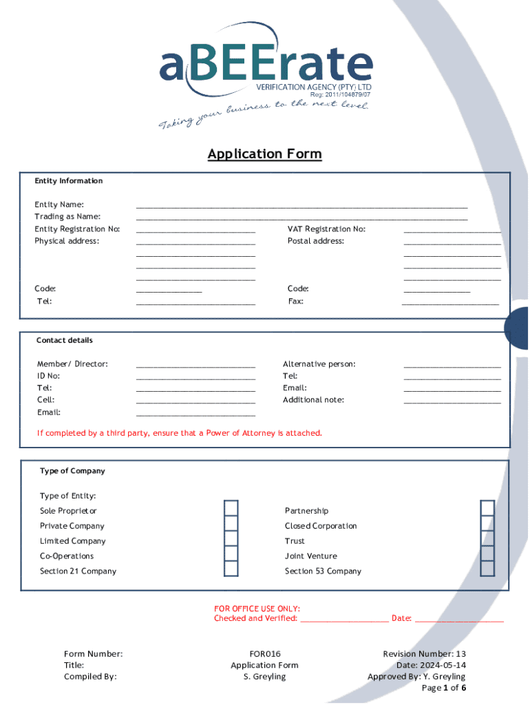 Application Form Entity InformationEntity Name:___Trading as Name:___Entity Registration No:___VAT Registration No:___Physical address:___Postal address:__________________ Code: Tel:______Code:______Fax:___Contact