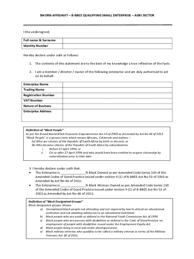 A sworn affidavit BBEEE qualifying small is a legal document that confirms a business's status as a small enterprise in accordance with the Broad-Based Black Economic Empowerment (B-BBEE) regulations.