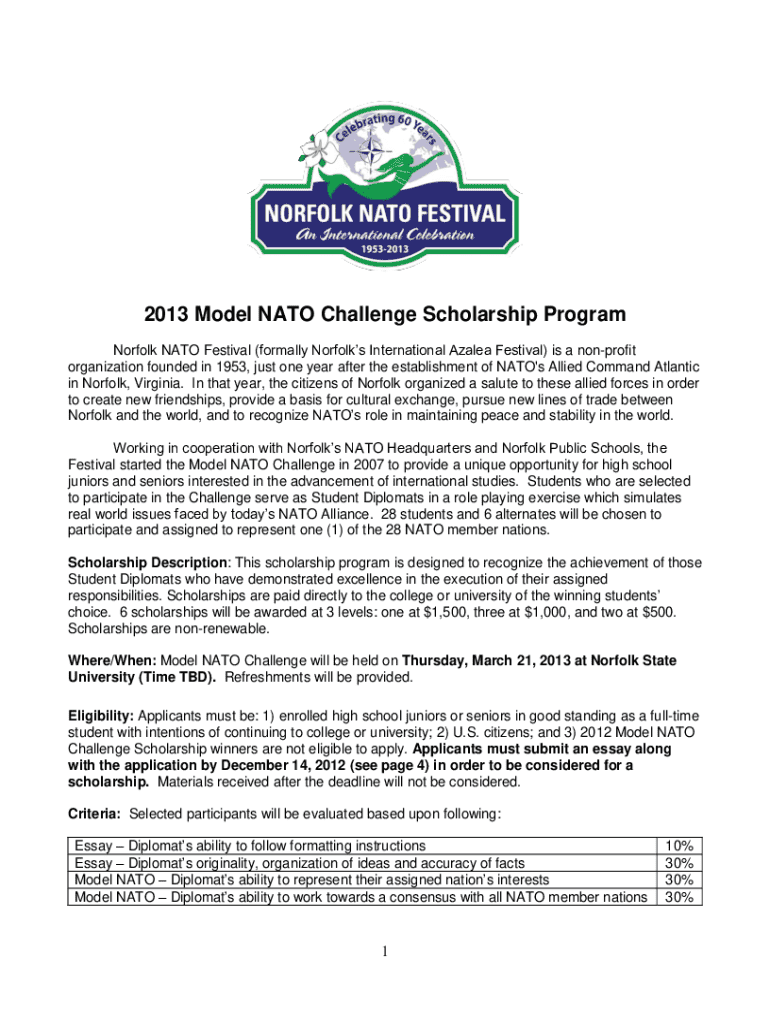 2013 Model NATO Challenge Scholarship Program Norfolk NATO Festival (formally Norfolk's International Azalea Festival) is a nonprofit organization founded in 1953, just one year after the establishment