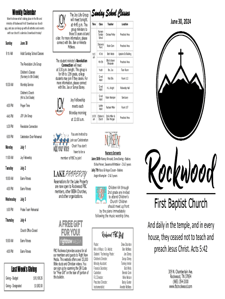 Stay updated with the activities of Rockwood First Baptist Church by checking our weekly calendar. Join us for events, Bible studies, and worship services!