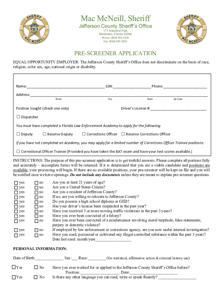 Fax: (850) 9970756PRESCREENER APPLICATION