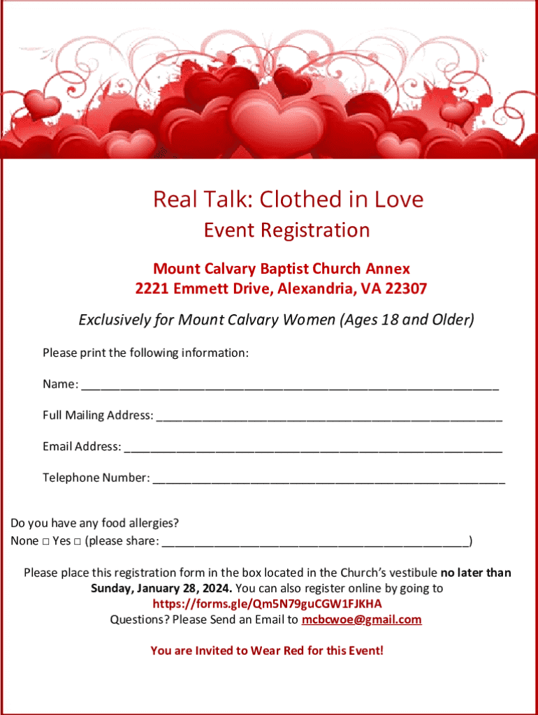 Register for the Real Talk: Clothed in Love event for Mount Calvary women. Join us on January 28, 2024, and wear red to participate!