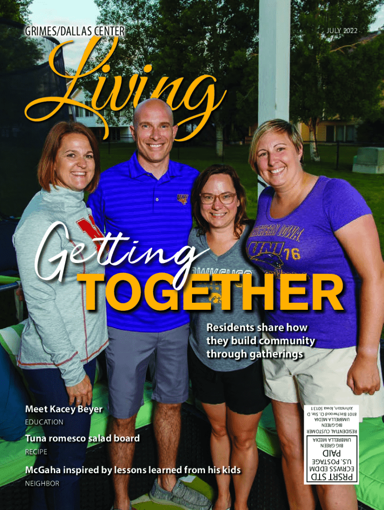 GRIMES/DALLAS CENTERLivingJULY 2022Getting TOGETHER Residents share how they build community through gatheringsMeet Kacey BeyerBIG GREEN UMBRELLA MEDIA 8101 Birchwood Ct. Ste. D Johnston, Iowa 50131EDUCATIONRESIDENTIAL CUSTOMERTuna romesco salad boardBIG GREEN UMBRELLA MEDIARECIPEPAIDECRWSS EDDM U.S. POSTAGENEIGHBORwww.iowalivingmagazines.comJULY | 2022PRSRT STDMcGaha inspired by lessons learned from his kidsGrimes/Dallas Center Living magazine1CONTACT A LENDER