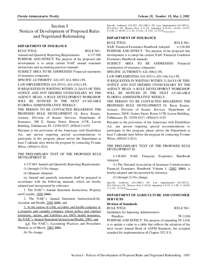 Florida Administrative WeeklyVolume 28, Number 18, May 3, 2002Section I Notices of Development of Proposed Rules and Negotiated Rulemaking DEPARTMENT OF INSURANCE RULE TITLE: RULE NO.: Annual and Quarterly Reporting Requirements 4137.001 PURPOSE AND EFFECT: The purpose of the proposed rule development is to adopt current NAIC annual statement instructions and accounting practices manuals. SUBJECT AREA TO BE ADDRESSED: Financial statements of insurance companies. SPECIFIC AUTHORITY: 624.307, 624