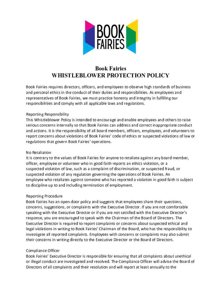 Book Fairies WHISTLEBLOWER PROTECTION POLICY Book Fairies requires directors, officers, and employees to observe high standards of business and personal ethics in the conduct of their duties and responsibilities.