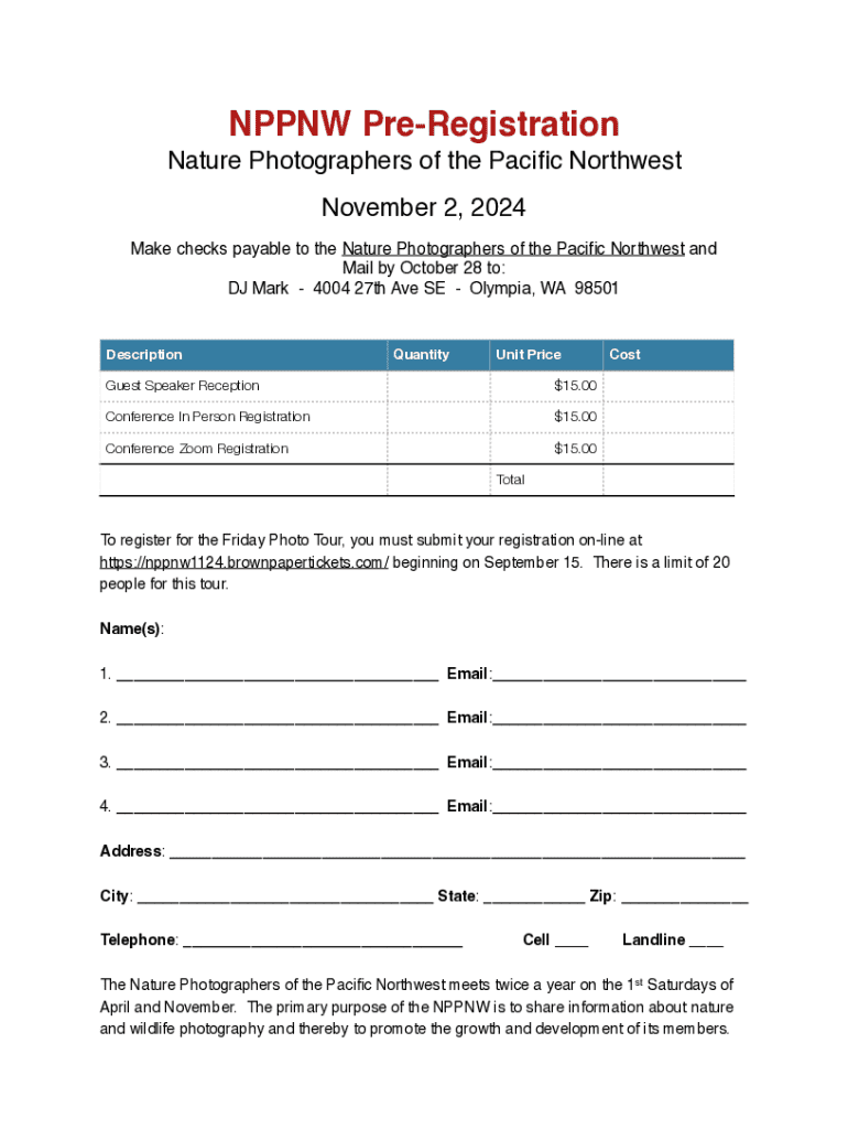 NPPNW PreRegistration Nature Photographers of the Paci c Northwest November 2, 2024 Make checks payable to the Nature Photographers of the Paci c Northwest and Mail by October 28 to: DJ Mark 4004