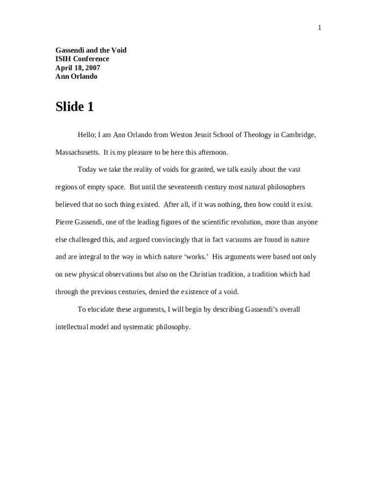The 1 Pierre Gassendi and the Void ISIH Conference Ann T. ... - web mit is a Word document required to be submitted to the required address to provide some info. It needs to be completed and signed, which may be done in hard copy, or via a particular solution e. g. PDFfiller. It lets you fill out any PDF or Word document directly from your browser (no software requred), customize it depending on your needs and put a legally-binding e-signature. Right away after completion, user can easily send the 1 Pierre Gassendi and the Void ISIH Conference Ann T. ... - web mit to the appropriate recipient, or multiple individuals via email or fax. The template is printable too thanks to PDFfiller feature and options proposed for printing out adjustment. In both electronic and in hard copy, your form will have a neat and professional outlook. You can also turn it into a template to use it later, so you don't need to create a new blank form from the beginning. You need just to amend the ready document.