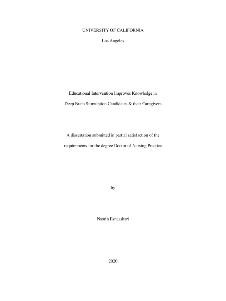 UNIVERSITY OF CALIFORNIA Los AngelesEducational Intervention Improves Knowledge in Deep Brain Stimulation Candidates & their CaregiversA dissertation submitted in partial satisfaction of the requirements for the degree Doctor of Nursing PracticebyNasrin Esnaashari2020 Copyright by Nasrin Esnaashari 2020ABSTRACT OF THE DISSERTATIONEducational Intervention Improves Knowledge in Deep Brain Stimulation Candidates & their CaregiversbyNasrin Esnaashari Doctor of Nursing Practice University