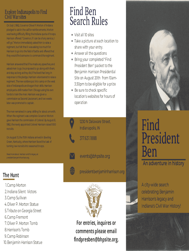 Join an exciting city-wide search in Indianapolis, exploring Civil War sites and celebrating Benjamin Harrison\'s legacy. Participate for a chance to win!
