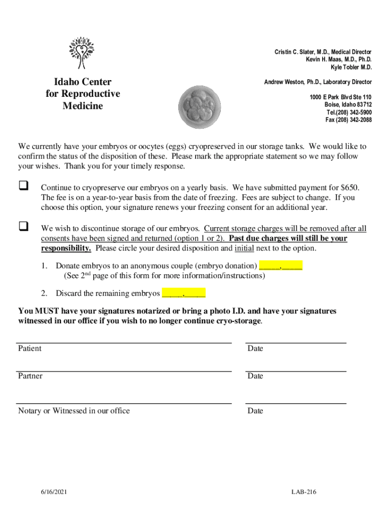 Confirm the disposition of your cryopreserved embryos. Choose to continue storage or donate them anonymously. Ensure timely response for proper management.