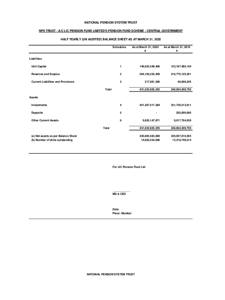 Explore the half-yearly balance sheet for NPS Trust LIC Pension Fund Limited for March 31, 2020, detailing liabilities, assets, and financial performance.
