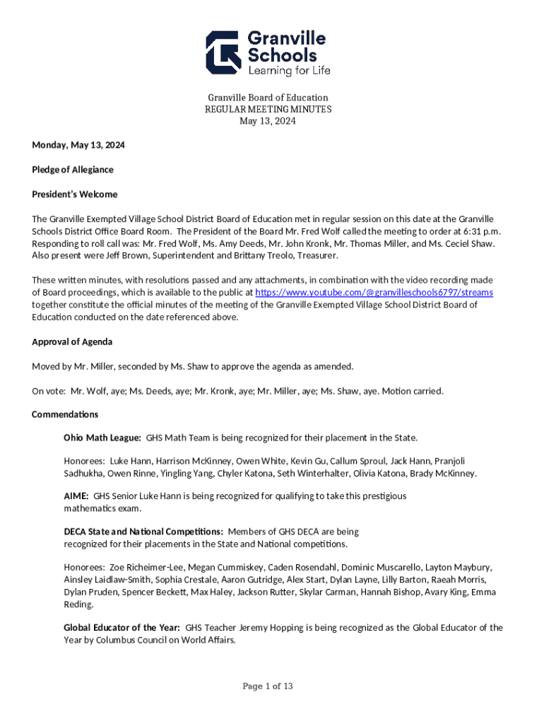 Granville Exempted Village School District Board Meeting Minutes template instructions