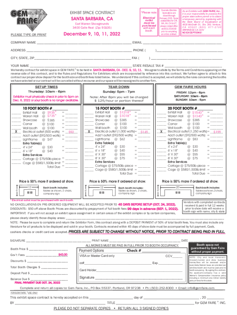 Contract for exhibit space at the Santa Barbara Gem Free on Dec 9-11, 2022. Includes terms, conditions, and pricing for booths and equipment.
