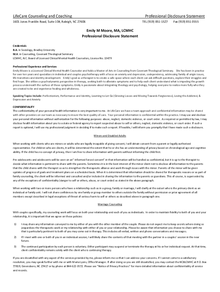 Get the free Emily M Moore, MA, LCMHC Professional Disclosure ...