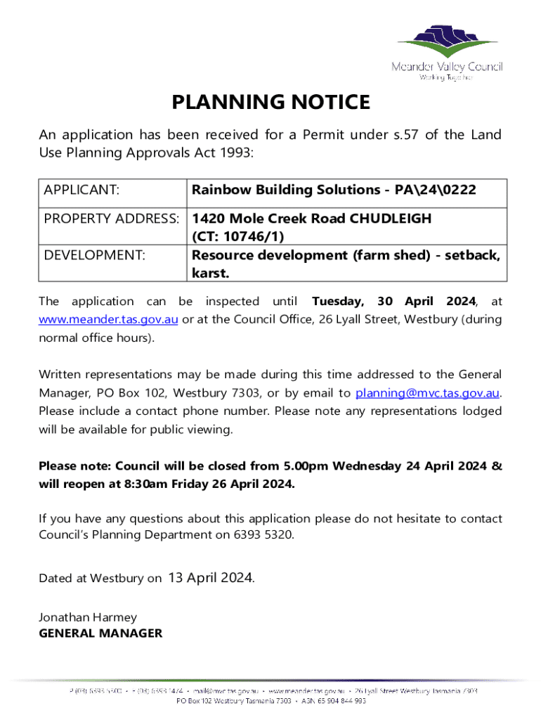 This document details a planning permit application for a farm shed at 1420 Mole Creek Road, Chudleigh. Public comments accepted until April 30, 2024.