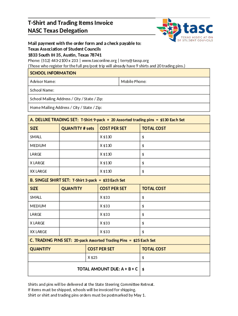 T-Shirt and Trading Items Invoice NASC Texas Delegation template instructions