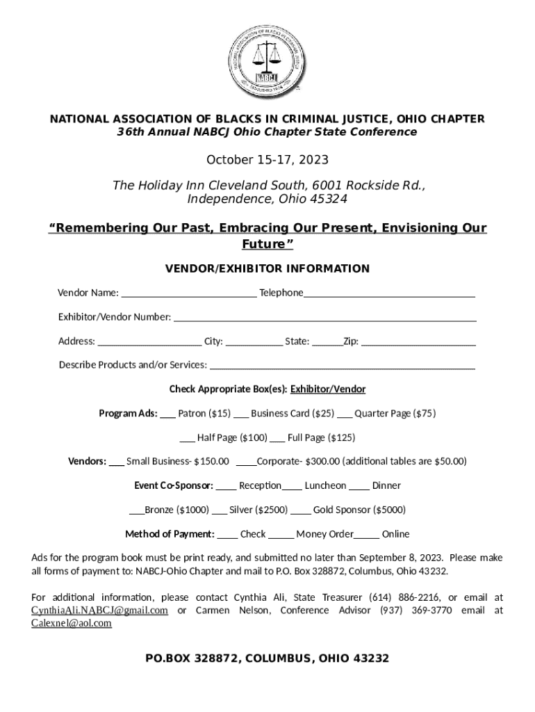 The Nabcj_ohio_conference_2023 is a document that should be submitted to the relevant address to provide certain info. It has to be filled-out and signed, which is possible manually in hard copy, or with a certain software such as PDFfiller. This tool lets you complete any PDF or Word document directly in your browser, customize it according to your needs and put a legally-binding electronic signature. Once after completion, the user can send the Nabcj_ohio_conference_2023 to the appropriate receiver, or multiple ones via email or fax. The template is printable as well due to PDFfiller feature and options presented for printing out adjustment. Both in electronic and physical appearance, your form should have a clean and professional appearance. You may also turn it into a template to use it later, there's no need to create a new file again. All that needed is to amend the ready template.