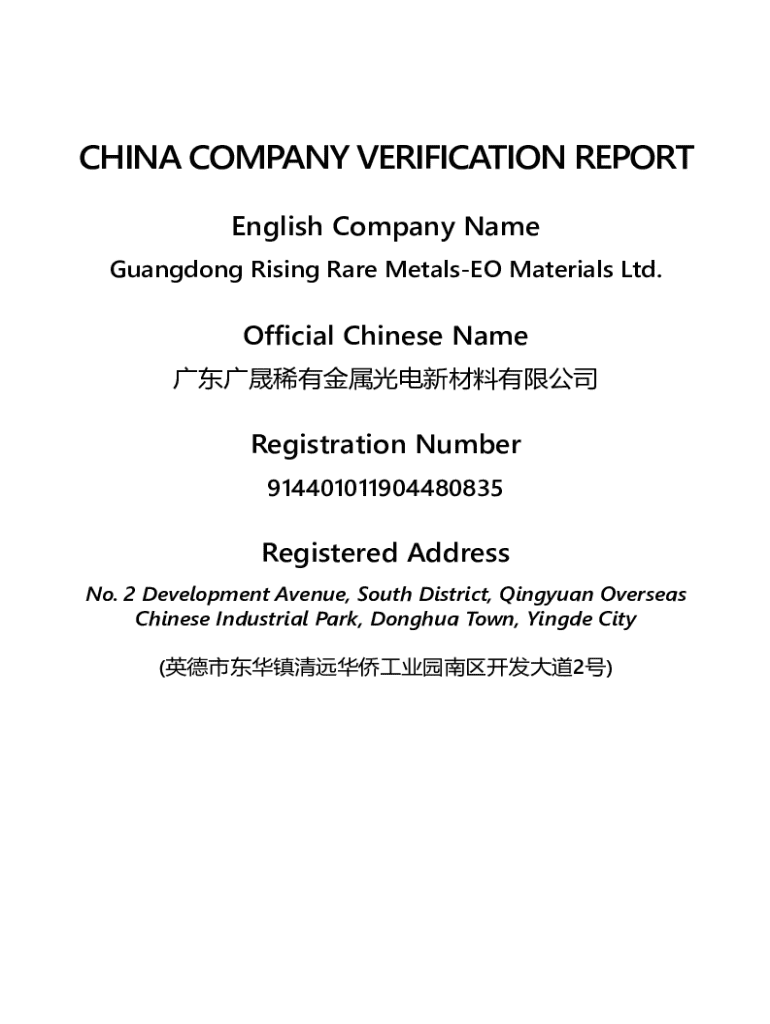CHINA COMPANY VERIFICATION REPORT English Company Name Guangdong Rising Rare MetalsEO Materials Ltd.Official Chinese Name Registration Number 914401011904480835Registered Address No. 2 Development