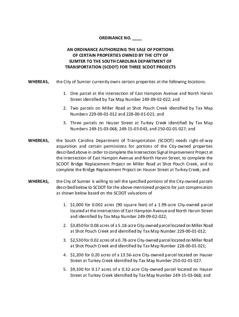 ORDINANCE NO. ___ AN ORDINANCE AUTHORIZING THE SALE OF PORTIONS OF CERTAIN PROPERTIES OWNED BY THE CITY OF SUMTER TO THE SOUTH CAROLINA DEPARTMENT OF TRANSPORTATION (SCDOT) FOR THREE SCDOT PROJECTS