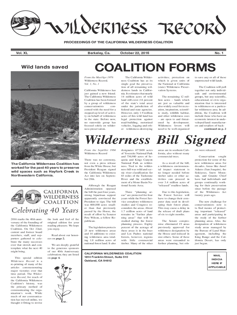 PROCEEDINGS OF THE CALIFORNIA WILDERNESS COALITION Berkeley, Ca. Vol. Wild lands saved October 22, 2016No. 1COALITION FORMS From the Mar/Apr 1976 Wilderness Record, Vol. 1, No. 1 California Wilderness