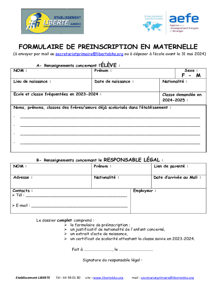 (envoy er par mail AU secretariatprimaire@libertebko.org of poser Cole savant LE 31 Mai 2024)NOT :A Restatements concern ant love :