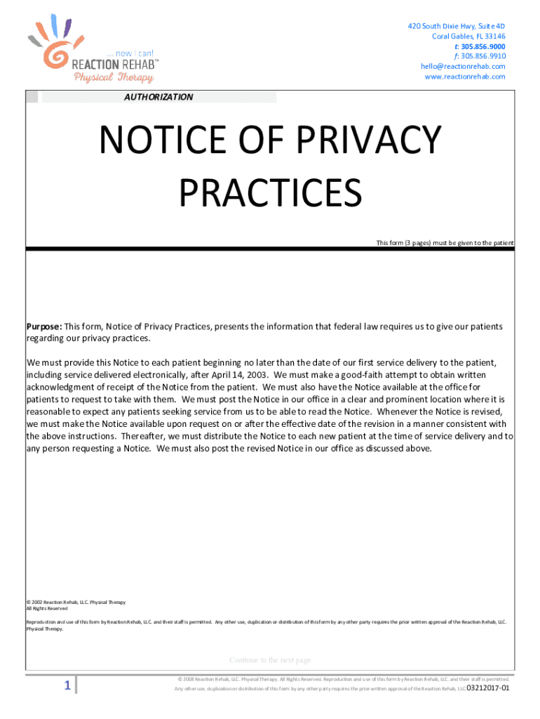 This Notice of Privacy Practices outlines how Reaction Rehab uses and discloses health information, ensuring patient privacy rights and information access.