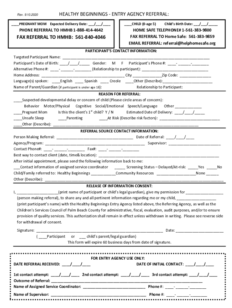 Rev. 9.10.2020HEALTHY BEGINNINGS ENTRY AGENCY REFERRAL:___PREGNANT MOM Expected Delivery Date: ___/___/___PHONE REFERRAL TO HMHB 18884144642FAX REFERRAL TO HMHB: 5618404046___CHILD (0age 5)Childs