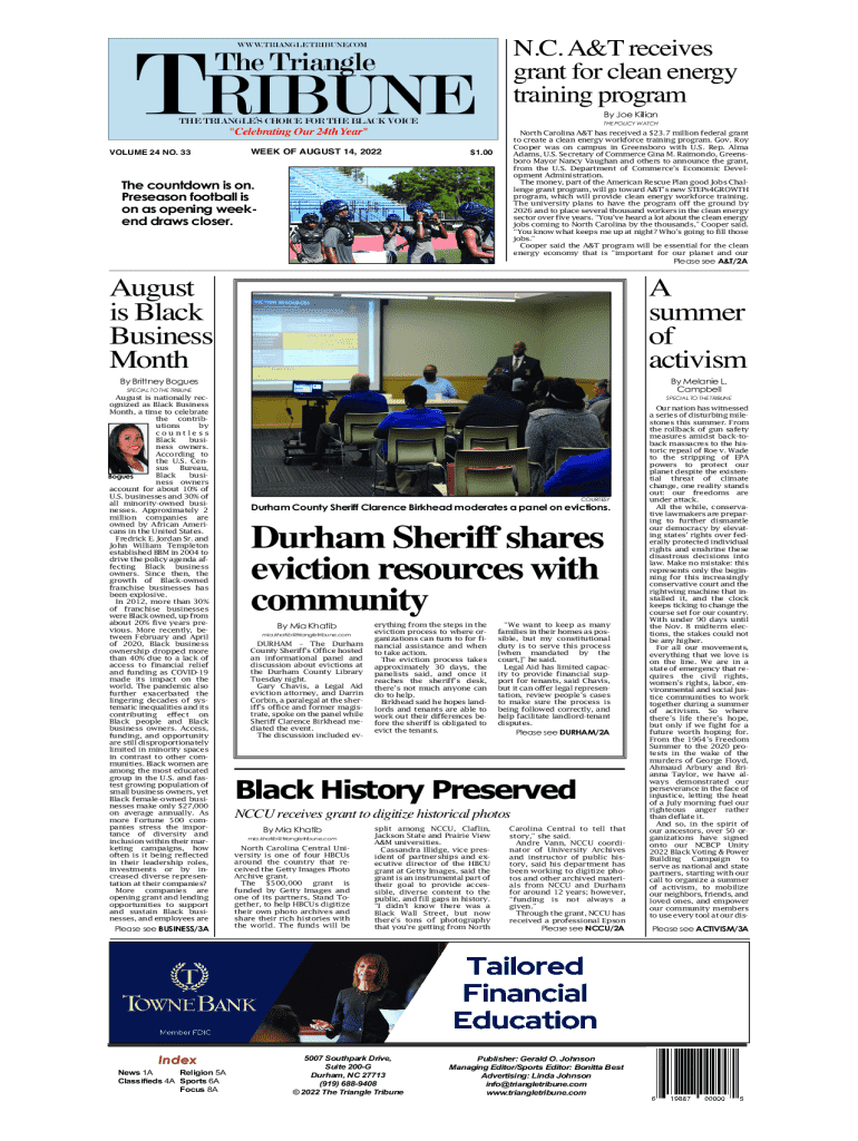 N.C. A&T receives grant for clean energy training programWWW.TRIANGLE TRIBUNE.COMBy Joe KillianTHE TRIANGLES CHOICE FOR THE BLACK VOICETHE POLICY WATCH\"Celebrating Our 24th Year\" VOLUME 24 NO. 33WEEK OF AUGUST 14, 2022North Carolina A&T has received a $23.7 million federal grant to create a clean energy workforce training program. Gov. Roy Cooper was on campus in Greensboro with U.S. Rep. Alma Adams, U.S. Secretary of Commerce Gina M. Raimondo, Greensboro Mayor Nancy Vaughan and others to...