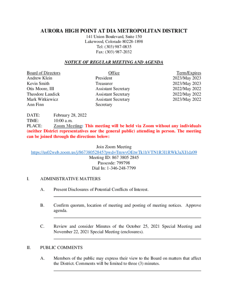 Get the free Aurora High Point at Dia Metropolitan District Meeting Agenda