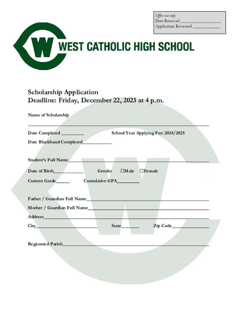 Apply for the West Catholic High School Scholarship for the 2024/2025 school year. Ensure all documents are submitted by December 22, 2023 at 4 p.m.