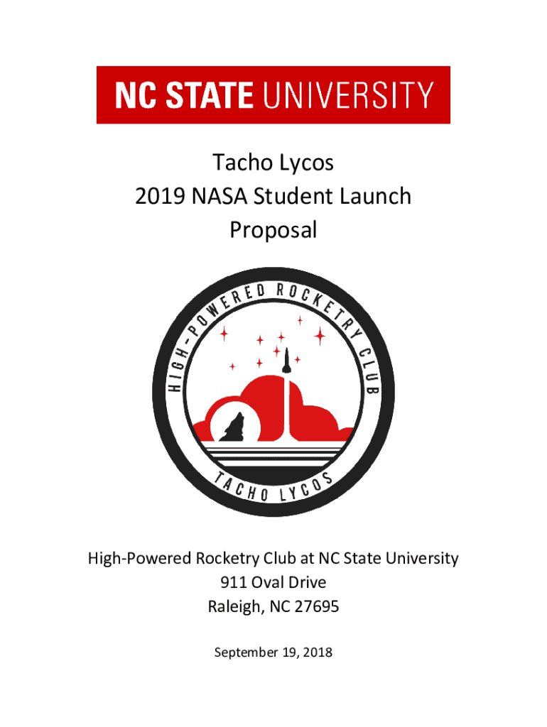 Tacho Lycos 2019 NASA Student Launch ProposalHighPowered Rocketry Club at NC State University 911 Oval Drive Raleigh, NC 27695 September 19, 2018Common Abbreviations & Nomenclature AGL APCP ARRD AV BP CDR CG CP EIT FAA FMECA FN FRR HEO HPR HPRC L3CC LCO LRR MAE MSDS MSFC NAR NCSU NFPA PDR PLAR PPE RFP RSO SL SLS SME SOW STEM TAP TRA UAV above ground level ammonium perchlorate composite propellant advanced retention