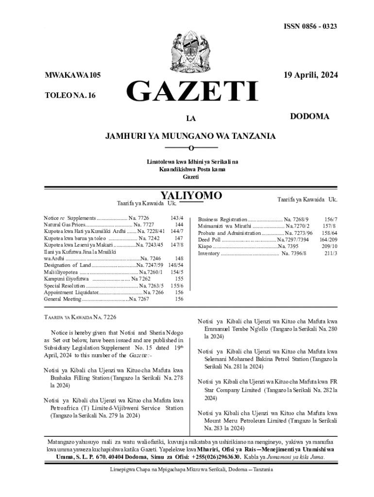 19 Aprili 2024ISSN 0856 0323MWAKA WA 10519 Aprili, 2024GAZETITOLEO NA. 16DODOMALAJAMHURI YA MUUNGANO WA TANZANIA O Linatolewa kwa Idhini ya Serikali na Kuandikishwa Posta kama GazetiYALIYOMOTaarifa ya Kawaida Uk.Notice re Supplements ...................... Na. 7726 143/4 Natural Gas Prices.................................. Na. 7727 144 Kupotea kwa Hati ya Kumiliki Ardhi ....... Na. 7228/41 144/7 Kupotea kwa barua ya toleo ..................... Na. 7242 147 Kupotea kwa Leseni ya Makazi