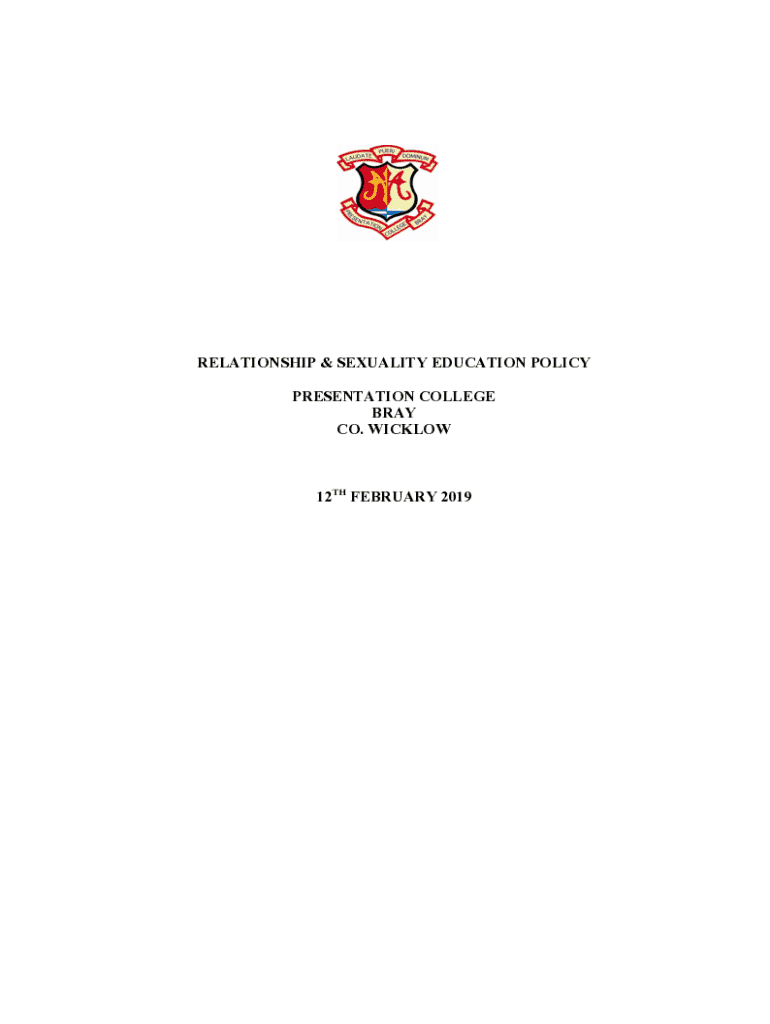 This policy outlines the Relationship and Sexuality Education program at Presentation College Bray, focusing on student health and personal development in a safe learning environment.