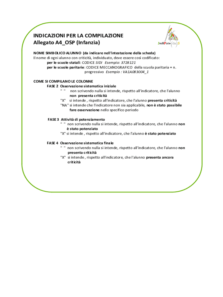 Ottieni il gratuito INDICAZIONI PER LA COMPILAZIONE Allegato A4OSP (Infanzia)