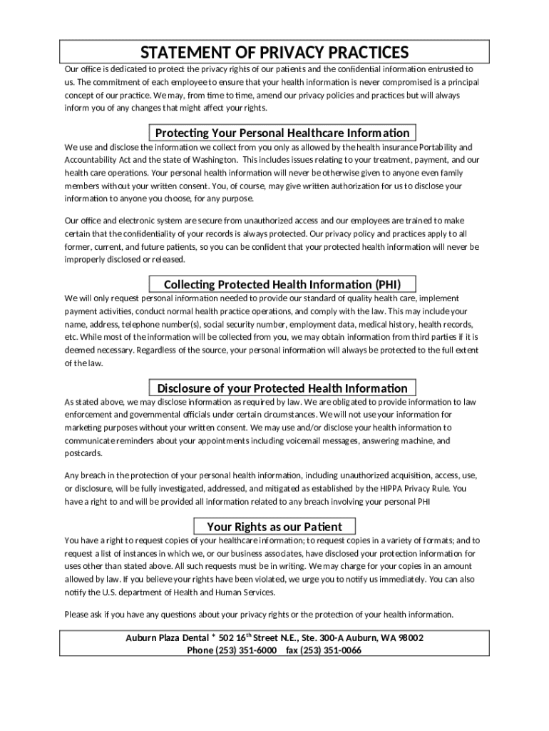Statement of Privacy Practices - Bear Creek Dentistry word template: frequently asked questions