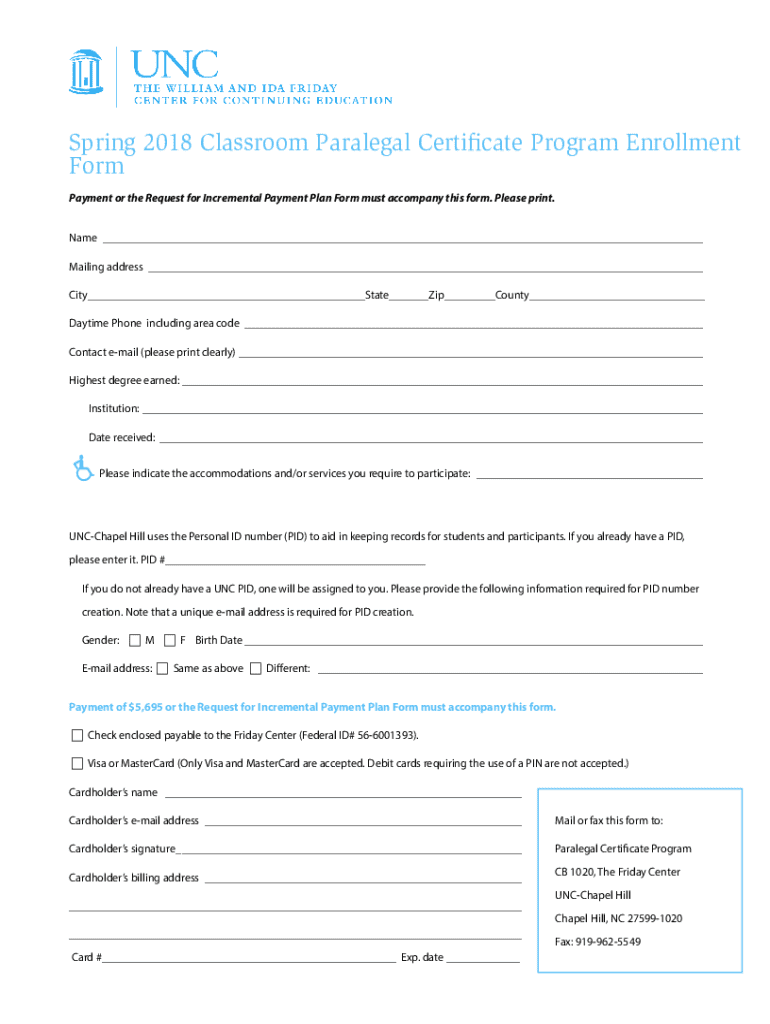 Get the free Spring 2018 Classroom Paralegal Certificate Program Enrollment Form - paralegal web unc